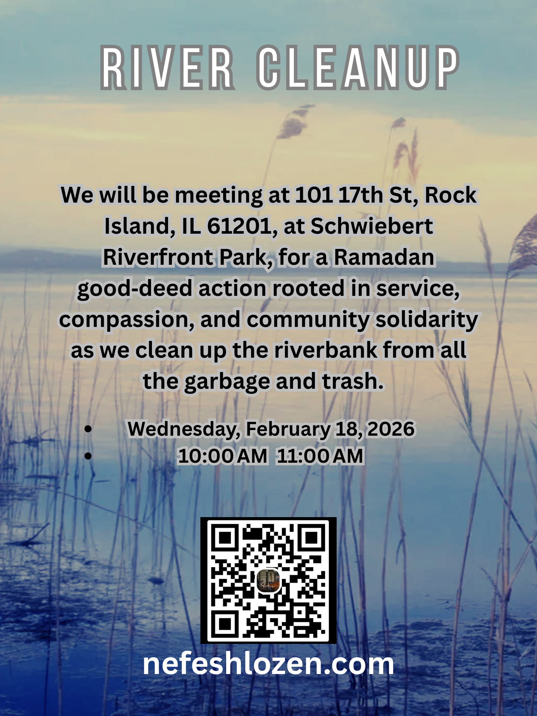 We will be meeting at 101 17th St, Rock Island, IL 61201, at Schwiebert Riverfront Park, for a Ramadan good‑deed action rooted in service, compassion, and community solidarity.